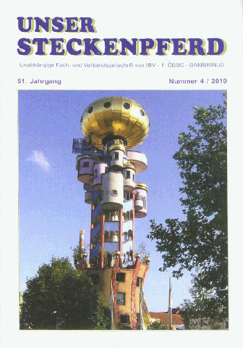 Unser Steckenpferd Nummer 4 / 2010 51. Jahrgang 112 Seiten Erscheinungsdatum: 11. November 2010 Zum Titelbild: Der Abensberger "Hundertwasser-Turm" auf dem Gelände der Brauerei zum Kuchlbauer ist eine Attraktion. Lesen Sie auch den Bericht auf Seite 345. Mit dieser Ausgabe von "Unser Steckenpferd" wurde das Verzeichnis "Wir suchen Tauschpartner" kostenfrei an unsere Mitglieder verschickt. | |